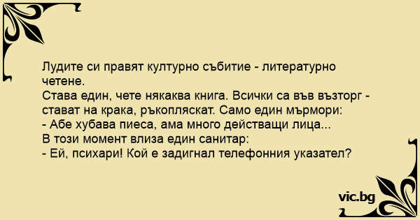 • Вицове от Facebook от нашата страница https://www.facebook.com/www.vic.bg