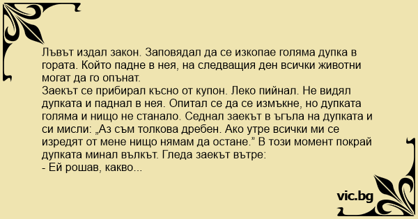 - Абе лъвът издаде закон. Да се изкопае тая дупка. Който пръв влезе в нея, утре може да опъне, което си иска животно в гората. Аз съм загорял за лисицата и реших да се възползвам.