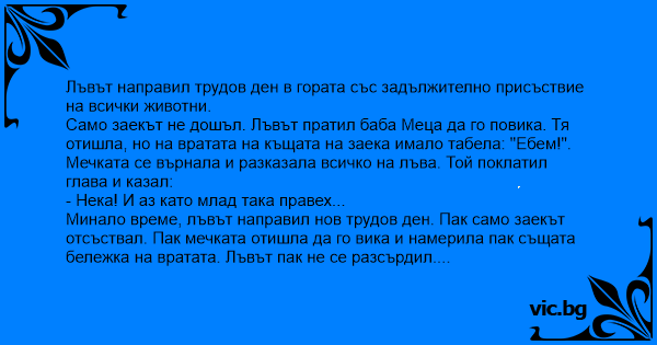 Само заекът не дошъл. Лъвът пратил баба Меца да го повика. Тя отишла, но на вратата на къщата на заека имало табела: "Eбem!".