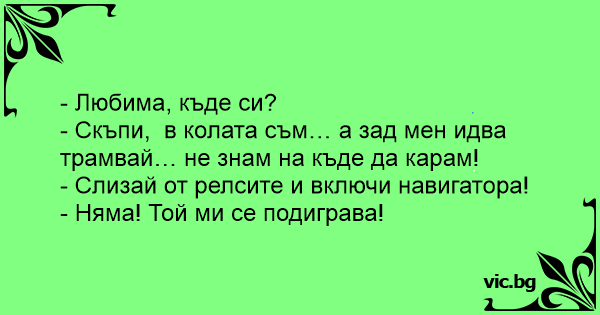 - Скъпи, в колата съм… а зад мен идва трамвай… не знам на къде да карам!