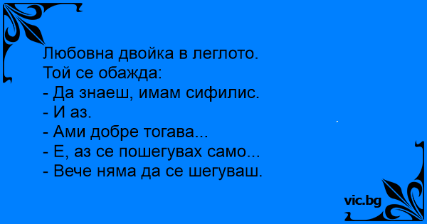 Alkalmi pár a hotelszobában meghitten szeretkezik, amikor a szőke csaj megszólal: - Van egy kis gond. AIDS-es vagyok... Srác: - Én is... Csaj: - De én csak vicceltem... Srác: - Többet nem fogsz!