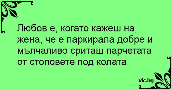 Любов е, когато кажеш на жена, че е паркирала добре и мълчаливо сриташ парчетата от стоповете под колата