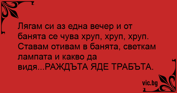 Лягам си аз една вечер и от банята се чува хруп, хруп, хруп.