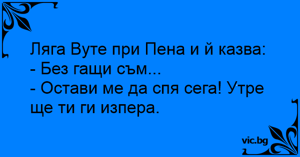 Sotul intra in pat Si-i sopteste sotiei la ureche: - Sunt Fara chiloti. Sotia , pe jumatate Adormita: - Lasa-ma sa dorm , maine am Sa-ti spal o pereche.