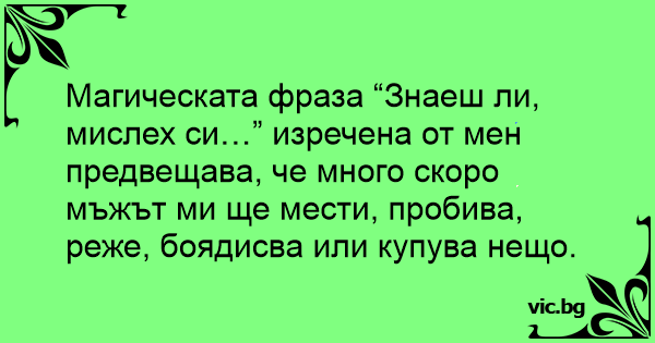Магическата фраза “Знаеш ли, мислех си…” изречена от мен предвещава, че много скоро мъжът ми ще мести, пробива, реже, боядисва или купува нещо.