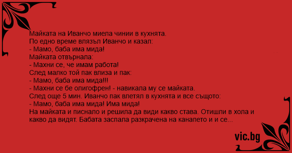 След още 5 мин. Иванчо пак влетял в кухнята и все същото: