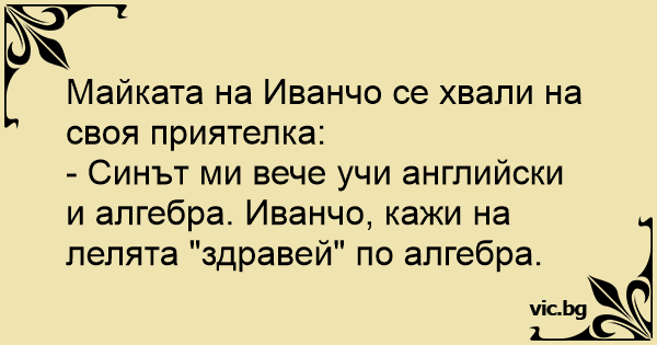 - Синът ми вече учи английски и алгебра. Иванчо, кажи на лелята "здравей" по алгебра.