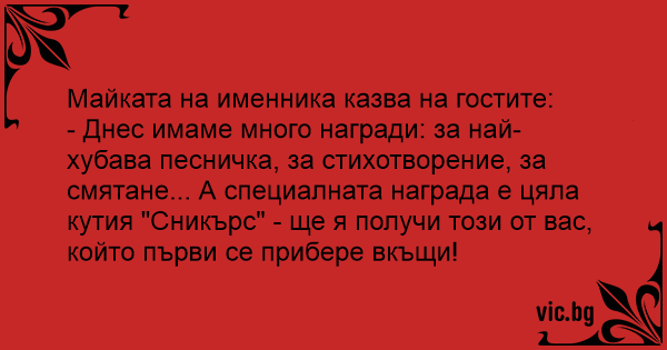 - Днес имаме много награди: за най-хубава песничка, за стихотворение, за смятане... А специалната награда е цяла кутия "Сникърс" - ще я получи този от вас, който първи се прибере вкъщи!