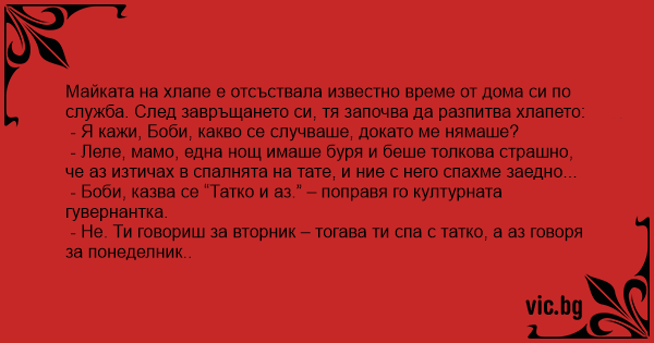 - Боби, казва се “Татко и аз.” – поправя го културната гувернантка.