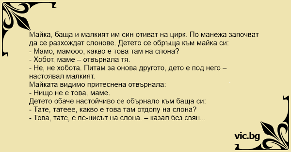 Майка, баща и малкият им син отиват на цирк. По манежа започват да се разхождат слонове. Детето се обръща към майка си: