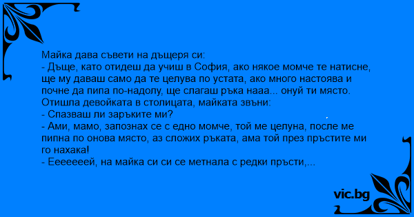 - Дъще, като отидеш да учиш в София, ако някое момче те натисне, ще му даваш само да те целува по устата, ако много настоява и почне да пипа по-надолу, ще слагаш ръка нааа... онуй ти място.