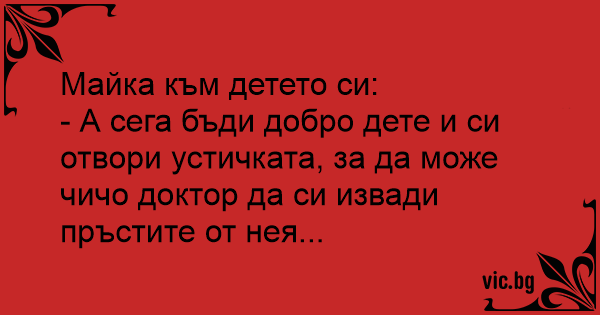- А сега бъди добро дете и си отвори устичката, за да може чичо доктор да си извади пръстите от нея...