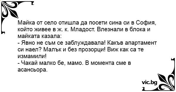 Майка от село отишла да посети сина си в София, който живее в ж. к. Младост. Влезнали в блока и майката казала: