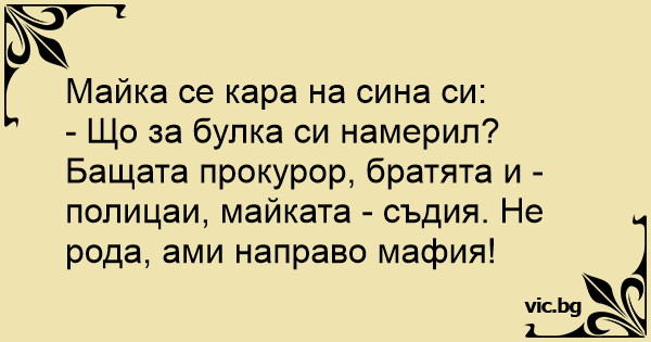 - Що за булка си намерил? Бащата прокурор, братята и - полицаи, майката - съдия. Не рода, ами направо мафия!