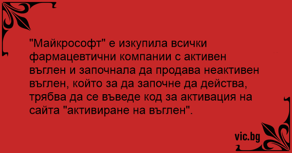 "Майкрософт" е изкупила всички фармацевтични компании с активен въглен и започнала да продава неактивен въглен, който за да започне да действа, трябва да се въведе код за активация на сайта "активиране на въглен".