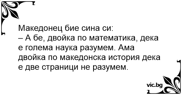 – А бе, двойка по математика, дека е голема наука разумем. Ама двойка по македонска история дека е две страници не разумем.
