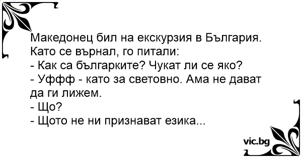 Македонец бил на екскурзия в България. Като се върнал, го питали: