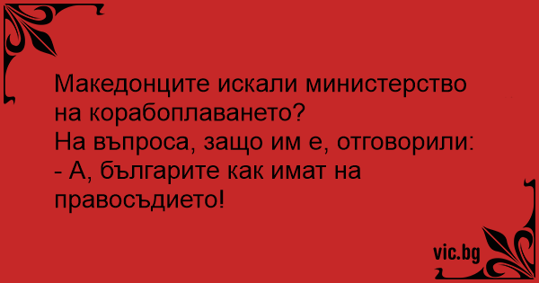 В Чехії вирішили утворити Міністерство морського флоту. У Москві страшенно здивувалися. — Навіщо воно вам? У вас же немає моря! — Ну й що? — здивувалися чехи — у вас же є Міністерство культури.