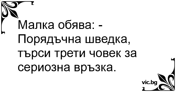 Малка обява: - Порядъчна шведка, търси трети човек за сериозна връзка.