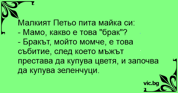 - Бракът, мойто момче, е това събитие, след което мъжът престава да купува цветя, и започва да купува зеленчуци.