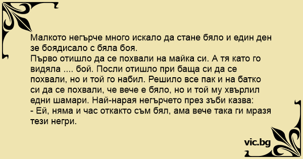 Първо отишло да се похвали на майка си. А тя като го видяла .... бой. Посли отишло при баща си да се похвали, но и той го набил. Решило все пак и на батко си да се похвали, че вече е бяло, но и той му хвърлил едни шамари. Най-нарая негърчето през зъби казва: