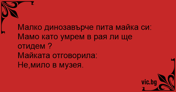 "Mama", fragt ein Dinosaurierbaby, "kommen Dinos auch in den Himmel?" "Nein, ins Museum", antwortet die Mutter.