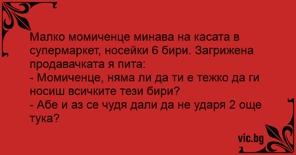 Малко момиченце минава на касата в супермаркет, носейки 6 бири. Загрижена продавачката я пита: