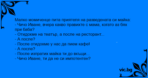• Вицове от Facebook от нашата страница https://www.facebook.com/www.vic.bg