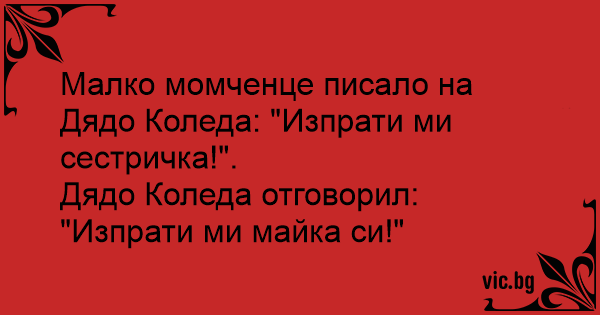 Му пишало некое дете на Дедо Мраз „Дедо Мраз те молам прати ми сестричка". Дедо Мраз му пишал "Ок, прати ја мајка ти"