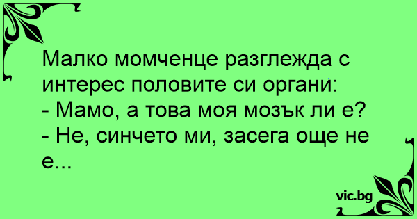Den lille fyr sidder i badekaret og mærker forsigtigt på sine testikler. "Mor, er det min hjerne?" "Ikke endnu, min dreng, ikke endnu .!"