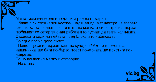 - Пешо, що си го вързал там тва куче, бе? Ако го вържеш за нашийника, ще бяга по-бързо, тоест пожарната ще пристига по-навреме.