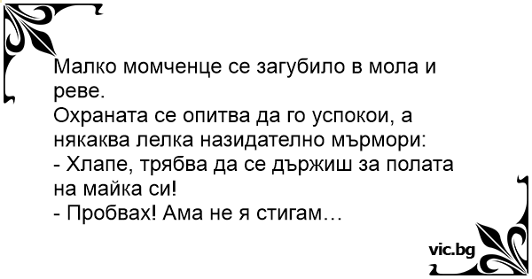 Un copil mic s-a pierdut în supermarket şi plânge necontenit. Oamenii din jur îl liniştesc spunându-i că îi vor găsi mama şi îi dau sfaturi: - Trebuia să te ţii de fusta mamei. - Am încercat, dar...
