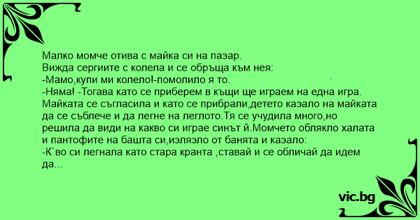-Няма! -Тогава като се приберем в къщи ще играем на една игра. Майката се съгласила и като се прибрали,детето каэало на майката да се съблече и да легне на леглото.Тя се учудила много,но решила да види на какво си играе синът й.Момчето облякло халата и пантофите на башта си,иэляэло от банята и каэало: