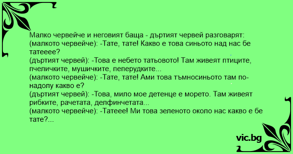 (малкото червейче): -Татеее! Ми това зеленото около нас какво е бе тате?