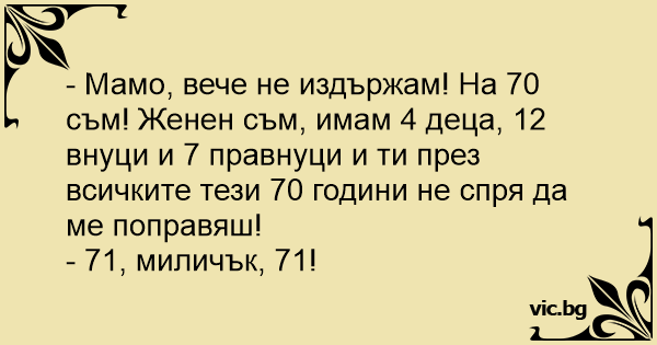 - Мамо, вече не издържам! На 70 съм! Женен съм, имам 4 деца, 12 внуци и 7 правнуци и ти през всичките тези 70 години не спря да ме поправяш!