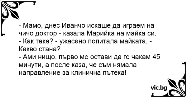 - Мамо, днес Иванчо искаше да играем на чичо доктор - казала Марийка на майка си.
