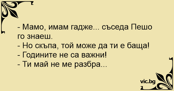 Le dice la hija a su madre, - Mamá estoy saliendo con el vecino. - Hija, podría ser tu padre!! - Mamá la edad ya no importa... - No me estás entendiendo....