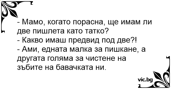 - Мамо, когато порасна, ще имам ли две пишлета като татко?