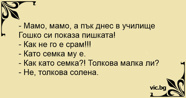 Разговараат две плавуши: - Вчера го промашив женското ВЦ и влегов во машкото. Замисли му го видов пенисот на шефот. - И каков му е? - Па за мој вкус премногу киселкасто - солен.