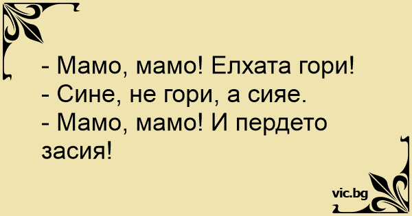 Малиот Трпе вика на мајка му: - Мамоо елката горииии! - Не се вика гори сине, се вика елката свети. - Епа добро тогаш и завесите ти светат да знаеш.