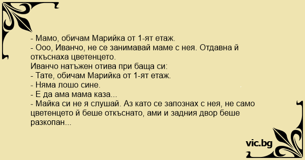 - Майка си не я слушай. Аз като се запознах с нея, не само цветенцето й беше откъснато, ами и задния двор беше разкопан...