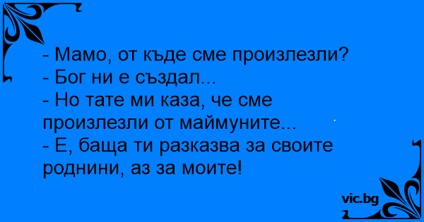 Το ανθρώπινο γένος - мама, а как мы появились на свет? - нас сотворил господь. - а... Учителката по богословие говори за първият мъж и първата жена, Адам и Ева, и как целия човешки род произлязъл от тях двамата. Госпожо, моят баща казва че произхождаме от маймуната. Учителката пита: Детенце пита: A child asked his father, "How were people born?" - Mamá, mamá, ¿de dónde venimos? O filho pergunta para o pai: A little girl asked her mother, "How did the human race begin?" Dialogo tra madre e figlio.,"Mamma ma noi da chi discendiamo?","Figlio mio, da Adamo ed Eva!","Ma come, papà mi ha detto che discendiamo dalla scimmia!","Tesoro, un conto è la famiglia di tuo padre, un conto è la mia." Mamá, mamá ¿es cierto que procedemos de los monos? ¡ nose hijo, tu padre no me presentó a su familia ¡. Jasiu pyta ojca: - Tato, czy to prawda co mówiła wczoraj Pani Kowalska, że ludzie pochodzą od małpy? - Być może synku... Nie znam rodziny Pani Kowalskiej. Ein Religionslehrer erklärt den Schülern die Entstehung des Menschen: "... und deshalb sind Adam und Eva unsere Vorfahren!" Meldet sich Max: "Aber meine Eltern sagen, wir stammen vom Affen ab."... Een dochter tegen haar moeder: "Mama, papa zegt dat we van de apen afstammen. Klopt dat?" Moeder: "Dat weet ik niet. Je vader heeft me nooit aan zijn familie voorgesteld." Jantje vraagt op een dag aan zijn vader: "Papa papa, hoe zijn de mensen ontstaan?" "Nou," zegt vader, "het begon allemaal met Adam en Eva." Jantje twijfelt een beetje aan het verhaal van zijn vader... Le pregunta Martina a su madre: - Mamá, ¿es verdad que desciendo del mono? - ¿Cómo quieres que lo sepa, si tu padre nunca me ha presentado a tus abuelos? Kristendomsfröken till klassen: - Vi härstammar alla från Adam och Eva. Pelle som sitter längst bak i klassrummet opponerar sig: - Men fröken, min pappa säger att vi härstammar från aporna. - Vi... Die kleine Paula fragt ihren Vater: "Papa, wie sind wir entstanden?" Der Vater erzählt seiner Tochter Paula die Geschichte von Adam und Eva. Dann geht die kleine Paula zu Ihrer Mutter: "Mama, wie... Ei lita jente spurte far sin: – Hvordan ble menneskene til? Faren svarte: – Gud skapte Adam og Eva, og de fikk barn, og slik ble hele menneskeheten til… Din dersi öğretmeni, öğrencilere bütün insanların Adem ve Havva’dan geldiğini söyledi. Bir öğrenci söz aldı: - Yapma be hocam babam bizim maymundan geldiğimizi söyledi. - Sevgili çocuğum, dedi... Una niña pregunta a su madre: -¿Cómo se creó la raza humana? -Pues hija, Dios creó a Adán y a Eva y estos tuvieron hijos y así fué. Dos dias despues, le pregunta a su padre y este le contesta:... Bir gün din kültürü öğretmeni öğrencilere: - Bizim soyumuz Adem ve Havva'dan geliyor demiş. Mehmet söz alarak: - Ama öğretmenim babam bana soyumuzun maymundan geldiğini söyledi. öğretmen; - Sizin... Le pregunta un niño a su mamá de dónde venían los seres humanos, y ella le contesta que venían de Adán y Eva. Él sale de donde está su mamá y se va con su papá y le hace la misma pregunta, él le... Op een dag vraagt een meisje aan haar mama: “Mama, waar komen de mensen eigenlijk vandaan?””Nou,” antwoordt haar mama, “God heeft de eerste mensen, Adam en Eva, op de wereld gezet. Adam en Eva... Çocuğun biri babasına sormuş : - Baba biz nasıl olduk? Baba cevap vermiş “maymunlar türeye türeye biz olduk” demiş… Tabi çocuk babasının lafına inanmamış. Annesine biz nasıl olduk demiş? Annesi,... - Mama, o tai tiesa, kad mes kilę iš beždžionių? - Nežinau, tėtis nenoriai pasakoja apie savo gimine… A 6 éves Panka megkérdezi az anyukájától: - Anyu, honnan jött az első ember? - Isten megteremtette az első emberpárt, Ádámot és Évát. Aztán nekik gyerekeik lettek, így lett élet a Földön. A kislány... Puisēns jautā tēvam: - «Kā radās cilvēki?» Tēvs: - «Reiz dzīvoja Ieva un Ādams. Viņiem piedzima bērni, pēc tam bērnu bērni un tā tālāk.» Puisēns aizskrien pie mam­mas: - «Mammu, kā radās cilvēki?»... Дете ја прашува мајката: - Мамо како настанале луѓето? - Од мајмуни сине! После тоа детето оди кај татко си: - Тато како настанале луѓето? - Господ ги створил сине! - Ама мама вика дека се... Une petite fille demande à sa mère: - Maman, comment est née l'humanité ? La mère lui raconte donc la version chrétienne avec Adam et Eve. Puis, la fille demande la même chose à son père. Il lui... Un jour, une petite fille demande à sa mère : - Dis maman, comment ils sont nés les tout-premiers parents ? - Eh bien, lui répond sa maman, c'est Dieu qui a créé les premiers parents humains, Adam...