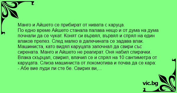 По едно време Айшето станала палава нещо и от дума на дума почнали да се чуkat. Конят си вървял, вървял и спрял на един влаков прелез. След малко в далечината се задава влак. Машиниста, като видял каруцата започнал да свири със сирената. Манго и Айшето не реагират. Оня набил спирачки. Влака скърцал, свирил, влачил се и спрял на 10 сантиметра от каруцата. Слиза машиниста от локомотива и почва да се кара: