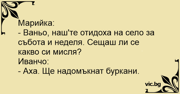 - Ваньо, наш'те отидоха на село за събота и неделя. Сещаш ли се какво си мисля?