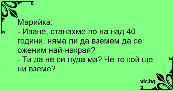 - Иване, станахме по на над 40 години, няма ли да вземем да се оженим най-накрая?