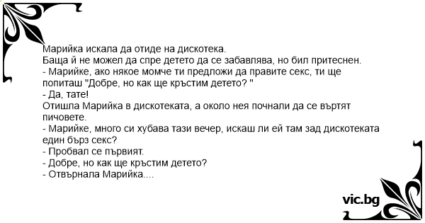 - Марийке, много си хубава тази вечер, искаш ли ей там зад дискотеката един бърз cekc?