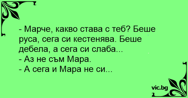 - Марче, какво става с теб? Беше руса, сега си кестенява. Беше дебела, а сега си слаба...