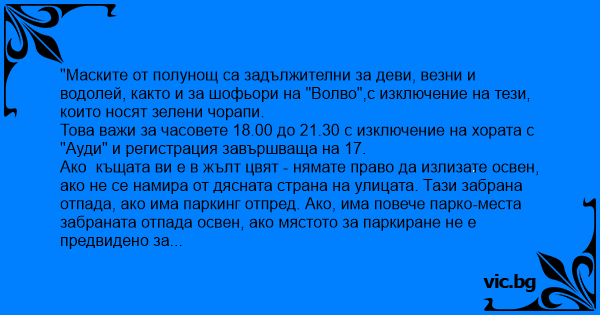 "Маските от полунощ са задължителни за деви, везни и водолей, както и за шофьори на "Волво",с изключение на тези, които носят зелени чорапи.