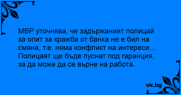 МВР уточнява, че задържаният полицай за опит за кражба от банка не е бил на смяна, т.е. няма конфликт на интереси... Полицаят ще бъде пуснат под гаранция, за да може да се върне на работа.