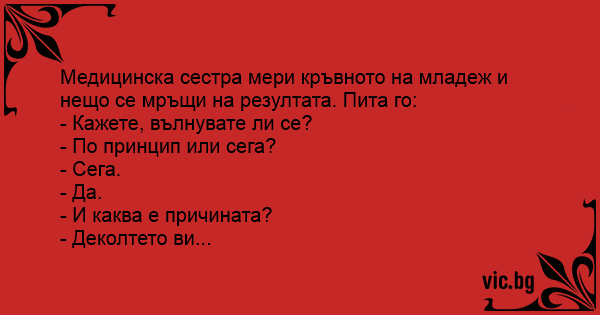 Медицинска сестра мери кръвното на младеж и нещо се мръщи на резултата. Пита го: